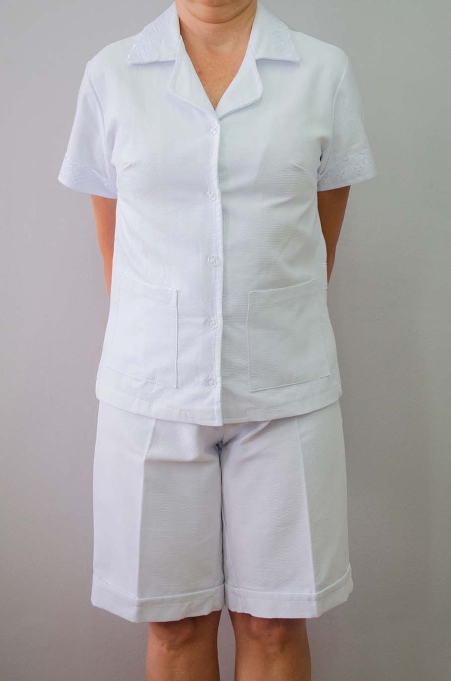 Conjunto de bermuda com gola, manga, bordado 5 cm e botão