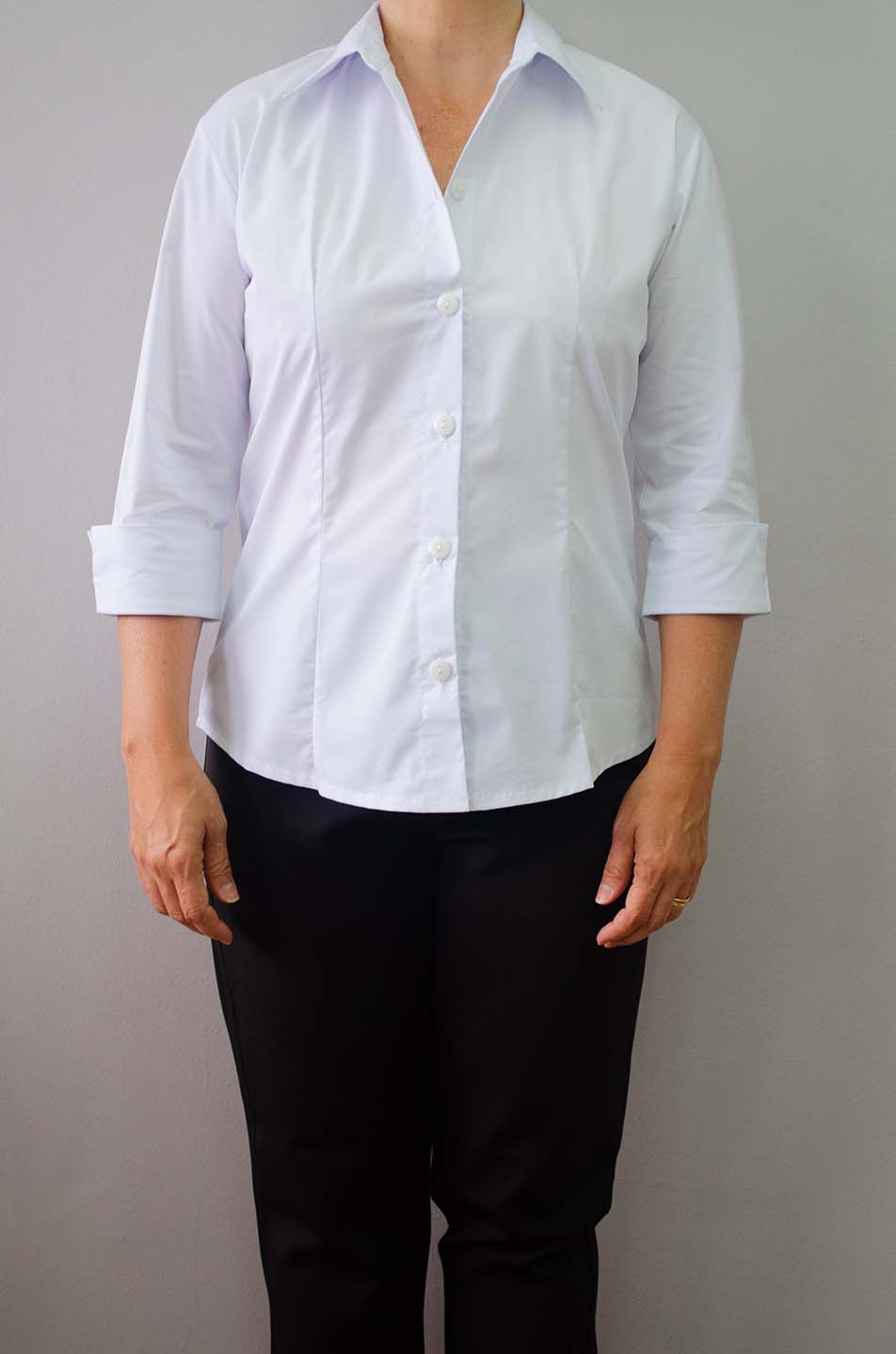 Camisa social feminina branca e Calça social feminina preta manga 3/4