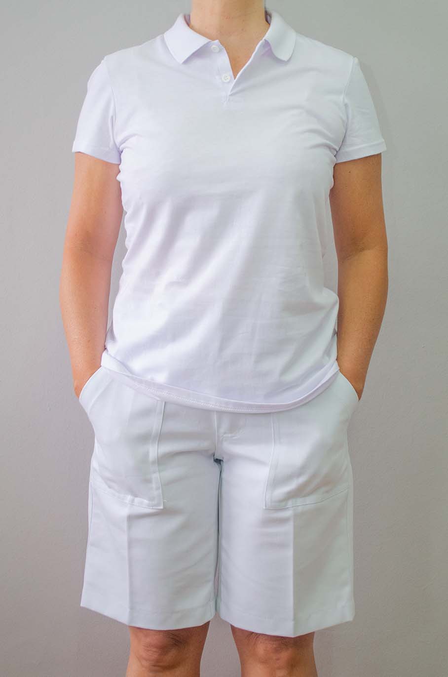 Camisa polo feminina branca e Bermuda brim branca bolsos